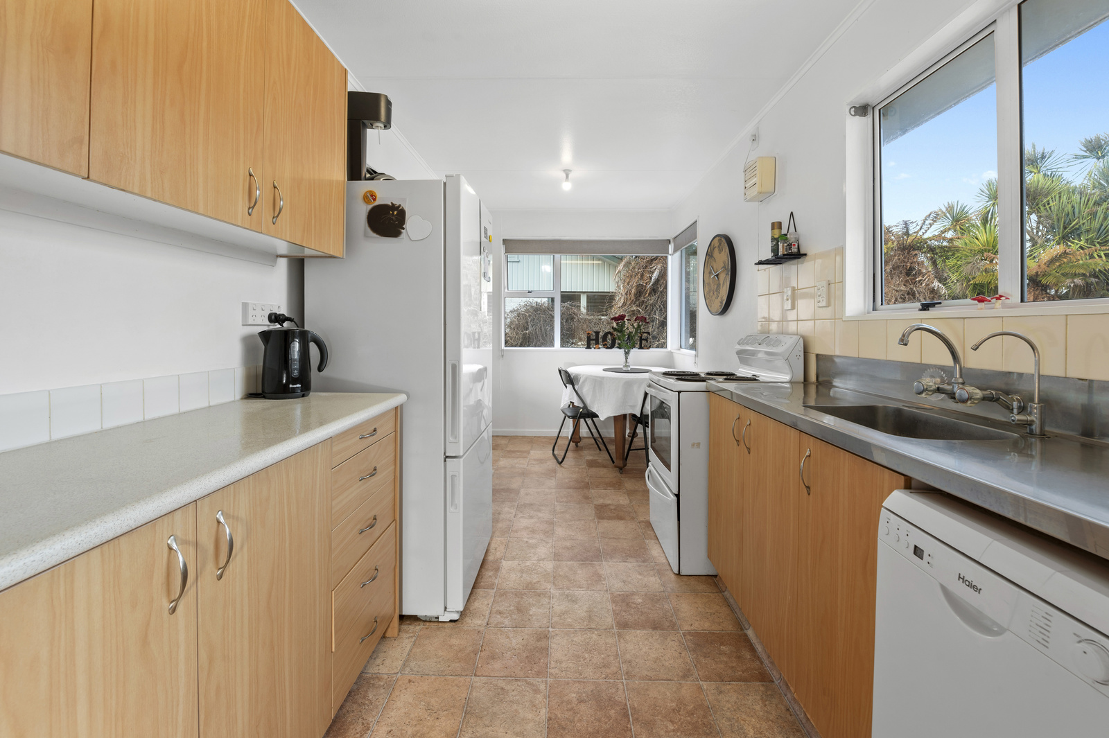 Spacious Family Home with Extra Sleepout and Garages . Tidy three-bedroom home with separate lounge and compliant wood burner for cosy winters. Practical galley kitchen and dining area, plus family bathroom, separate toilet, and laundry. Large section with plenty of room to enjoy the outdoors. Single garage, plus a second garage with sleepout and bathroom — ideal for extended family, teenagers, or Home office/Hobby room.